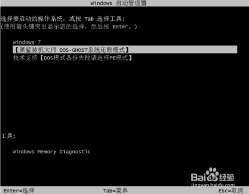 現(xiàn)在啟動(dòng)管理界面就會(huì)有兩個(gè)選擇【黑鯊系統(tǒng)裝機(jī)大師DOS-GHOST系統(tǒng)安裝模式】【黑鯊系統(tǒng)裝機(jī)大師PE-GHOST系統(tǒng)安裝模式】點(diǎn)擊回車。