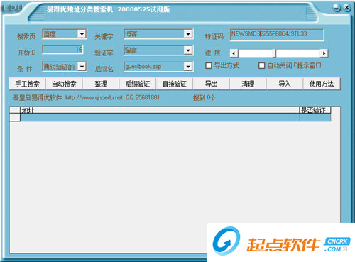易得優(yōu)地址分類搜索機是一款非常好用的網(wǎng)頁搜索工具,該工具可以對留言本、論壇中的內(nèi)容進行詳細搜索,用戶只需輸入搜索頁和關(guān)鍵字就可以找到自己想要看到內(nèi)容。