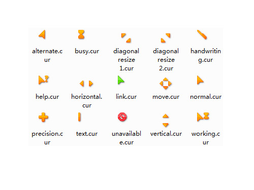 個性橙色鼠標指針是包含15個基本指針的鼠標指針文件,風格簡潔大方,黃色時尚另類,可用于搭配多種主題