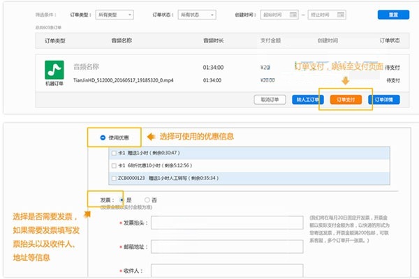 4.上傳音頻完成后,若為機(jī)器訂單,則直接跳轉(zhuǎn)至支付頁面;若為人工訂單,則訂單進(jìn)入“審核中”狀態(tài),審核完成后則可進(jìn)行訂單支付;