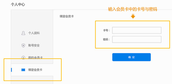 登陸后,在“個人中心”模塊中“綁定會員卡”項(xiàng),輸入卡號與密碼即可;如圖。綁定后的會員權(quán)限可在“我的會員卡”中具體查看。