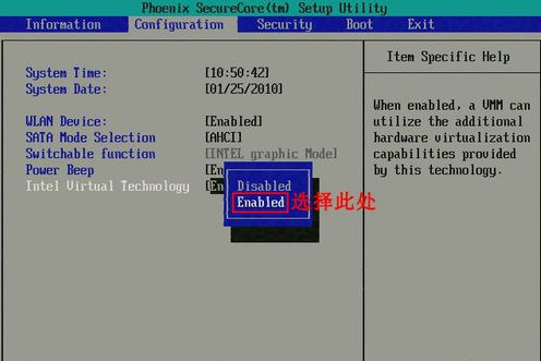(1)進入BIOS,選擇Configuration選項,選擇Intel Virtual Technology并回車。