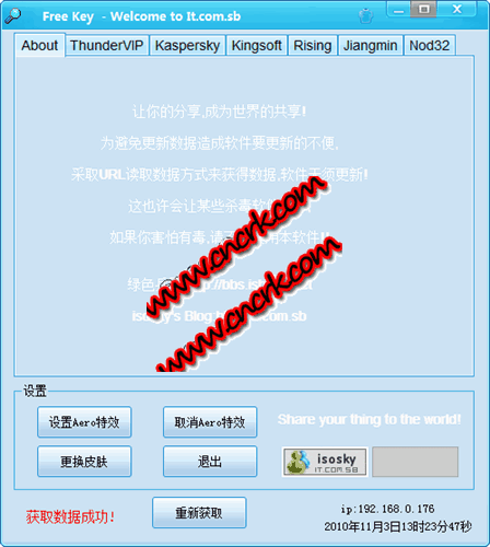 freekey軟件可獲取大量各大殺毒軟件的激活序列號(hào)及升級(jí)序列號(hào)和迅雷VIP賬號(hào),來源為網(wǎng)友共享,為了避免軟件更新造成的不便,采取URL讀取數(shù)據(jù)的方式獲得數(shù)據(jù),軟件無需更新!另外為了保護(hù)版權(quán),對(duì)文件加密了,可能導(dǎo)致您的殺毒軟件報(bào)毒,請(qǐng)自行酌情是否使用本軟件!本軟件僅僅是為了共享資源,絕對(duì)無廣告無毒。這個(gè)版本對(duì)皮膚進(jìn)行了美化,可自行下載皮膚并點(diǎn)擊設(shè)置皮膚進(jìn)行更換,在face目錄提供三個(gè)皮膚!