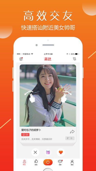 交友:左劃右劃瀏覽附近高顏值美女帥哥,左滑無感、右滑喜歡,互相喜歡即配對聊天,會員可直接私聊~拍攝:隨手拍出你的美照、10s短視頻,強大特效,一鍵發(fā)布即可收獲海量粉絲,與你互動~