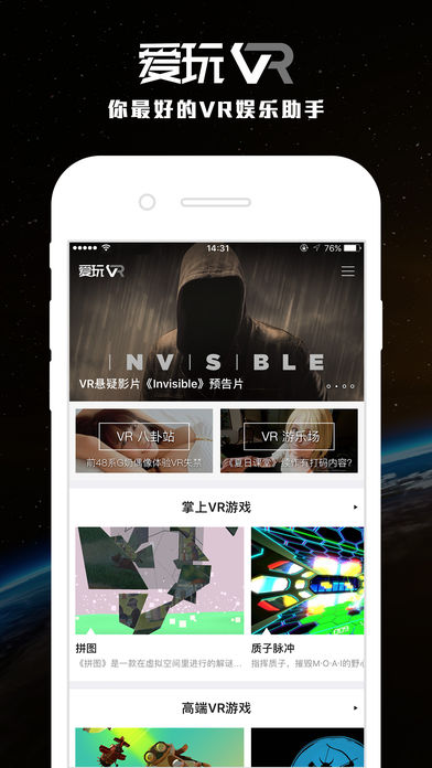 愛玩VR是目前國內(nèi)唯一致力于虛擬現(xiàn)實(shí)(VR)資訊傳播和資源推薦的中文綜合類APP,擁有最完整的VR設(shè)備和VR資源庫,每天給你推薦最好玩的VR資源,全年無休為你送上最新VR資訊。在這里你看不到濫竽充數(shù)的冒牌VR內(nèi)容或者泛濫成災(zāi)的3D電影,我們只推薦給你真正代表未來的視聽娛樂體驗(yàn)!【軟件特點(diǎn)】