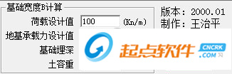 2、在軟件主界面輸入的基本參數(shù)有:荷載設(shè)計(jì)值,地基承載力設(shè)計(jì)值,基礎(chǔ)埋深,土容重,點(diǎn)擊“基礎(chǔ)寬度”按鈕就能確定出基礎(chǔ)寬度;