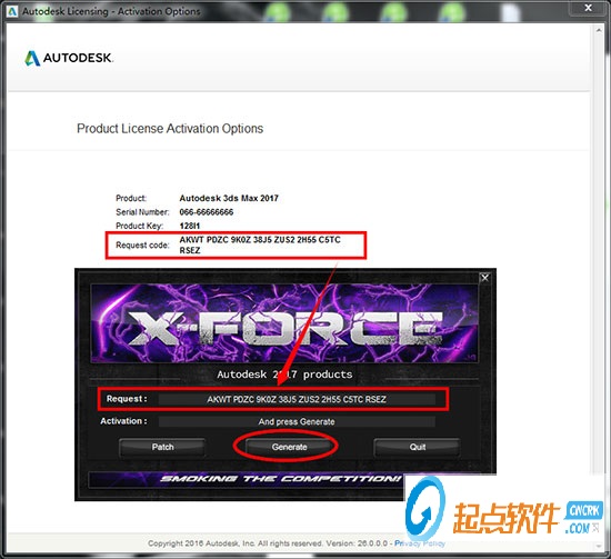 9、將“申請碼”復制到注冊機的第一項中,點擊“Generate”,生成激活碼