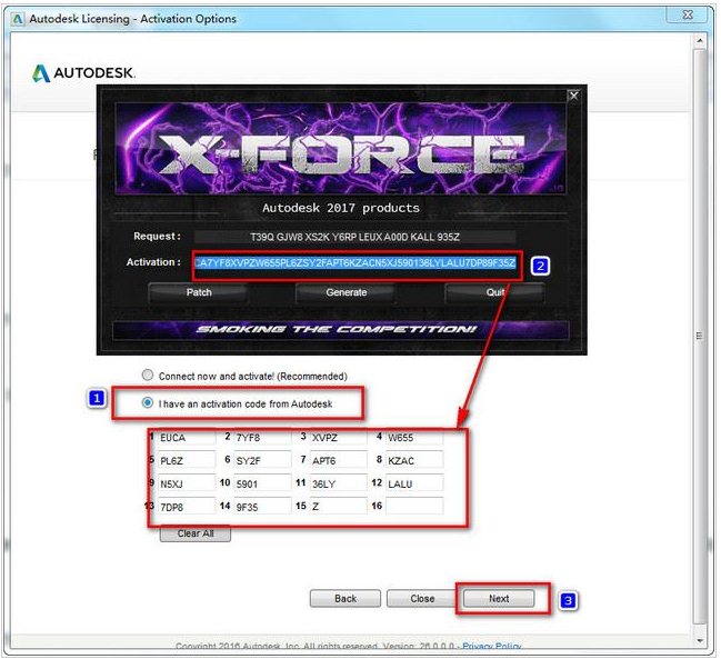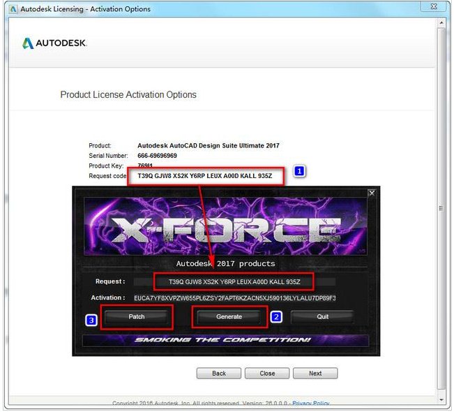 13.接下來會進(jìn)入如下界面,打開注冊機(jī).將激活界面中的“Request Code”復(fù)制粘貼到注冊機(jī)界面中。然后依次點(diǎn)擊注冊機(jī)界面中的“Generate”和“Patch”。如下圖
