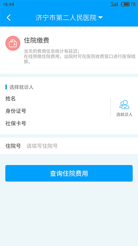 住院費用預(yù)繳:住院費用查詢、住院費用預(yù)繳、一日清查詢;