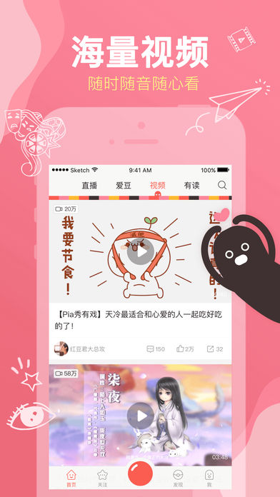 海量UGC原創(chuàng)視頻等你來(lái)勾搭,更有顏團(tuán)子、破耳兔等眾多萌物和你激萌Pia戲,滿足你的表演欲,建立專屬錄音棚,用自己的聲音做大片。