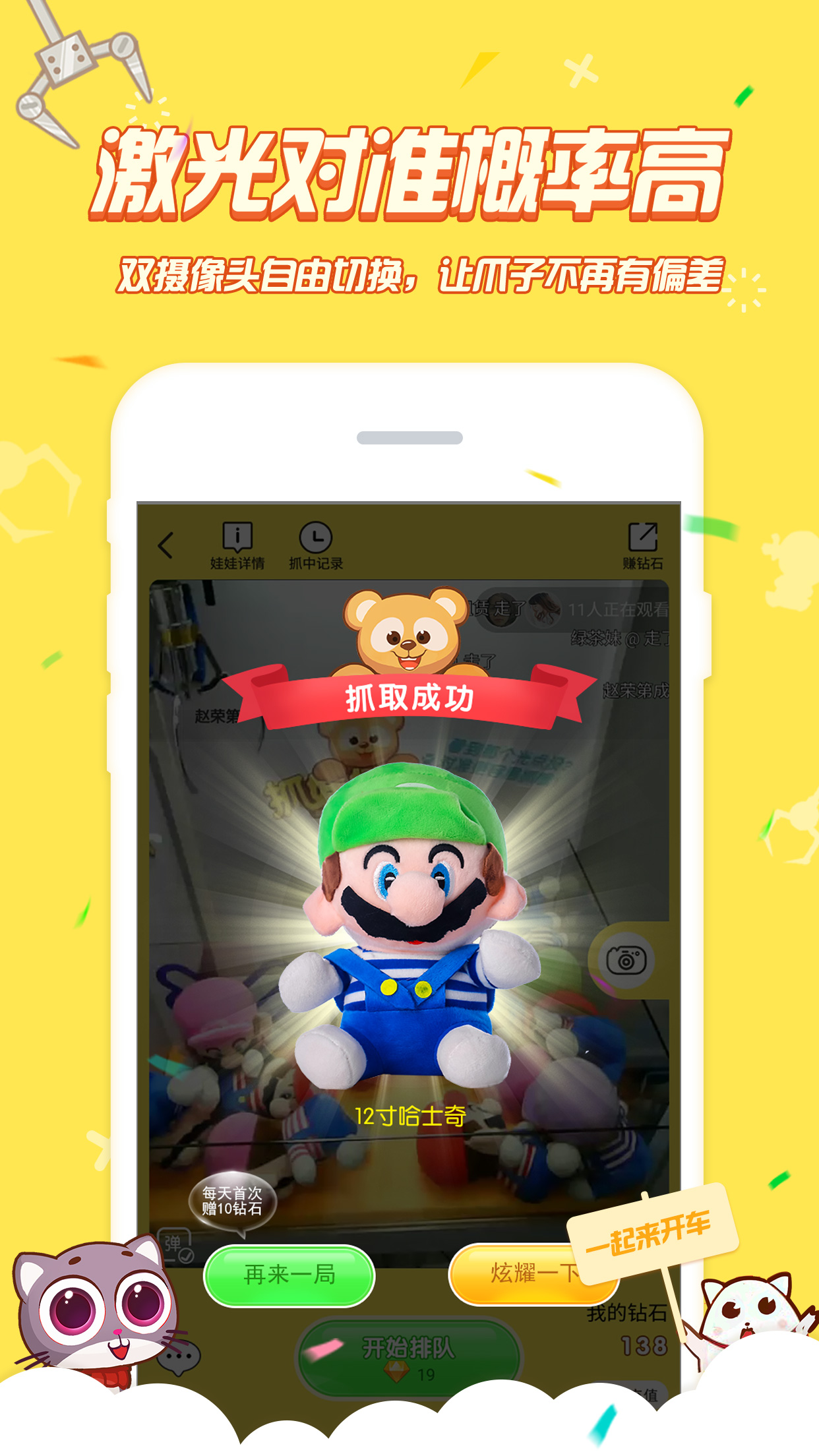 利用手機遙控真實娃娃機,完美體驗現(xiàn)場抓娃娃的樂趣。無論是在公交上,還是被窩里,隨時隨地都能歡樂抓娃娃。