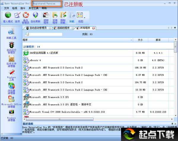 Revo Uninstaller 憑借其先進和快速的算法,徹底分析和掃描程序在系統(tǒng)和注冊表中的所有文件和鍵值,將程序徹底完全的移除,不會在系統(tǒng)中留下軟件的任何殘留!Revo Uninstaller Pro有一個非常強大的功能,稱為強制卸載。 強行卸載是最好的解決方案,你必須刪除頑固程序,部分已安裝的程序,部分卸載的程序!完全刪除程序,不留痕跡,你可以監(jiān)控所有系統(tǒng)安裝過程中所做的更改, 然后使用這些信息來卸載它。除此之外,Revo Uninstaller (卸載軟件)還包括其它一些實用的功能。例如:能夠幫助你清除系統(tǒng)中的LJ文件,無用的Office臨時文件,上網(wǎng)記錄,系統(tǒng)啟動項管理等。