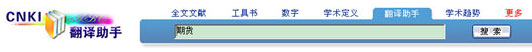 除了在CNKI翻譯助手首頁搜索外,您還可以在翻譯結(jié)果頁面的上方搜索框輸入關(guān)鍵詞進(jìn)行翻譯檢索。