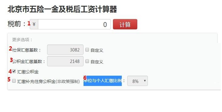 1、打開這個計算器,輸入稅前工資,可選擇社保匯繳基數(shù)、公積金匯繳基數(shù)、匯繳公積金、匯繳補充住房公積金(非政策強制)、單位與個人匯繳比例;