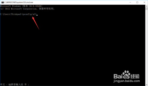 回車后,彈出命令符窗口,輸入“ipconfig/all”,然后進(jìn)行回車,就會看到一連串的返回信息。