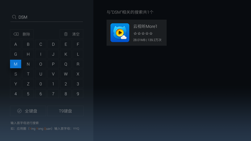 2.在搜索頁(yè)面,輸入“DSM”,即電視貓首字母,搜索到電視貓視頻(云視聽(tīng)MoreTV);