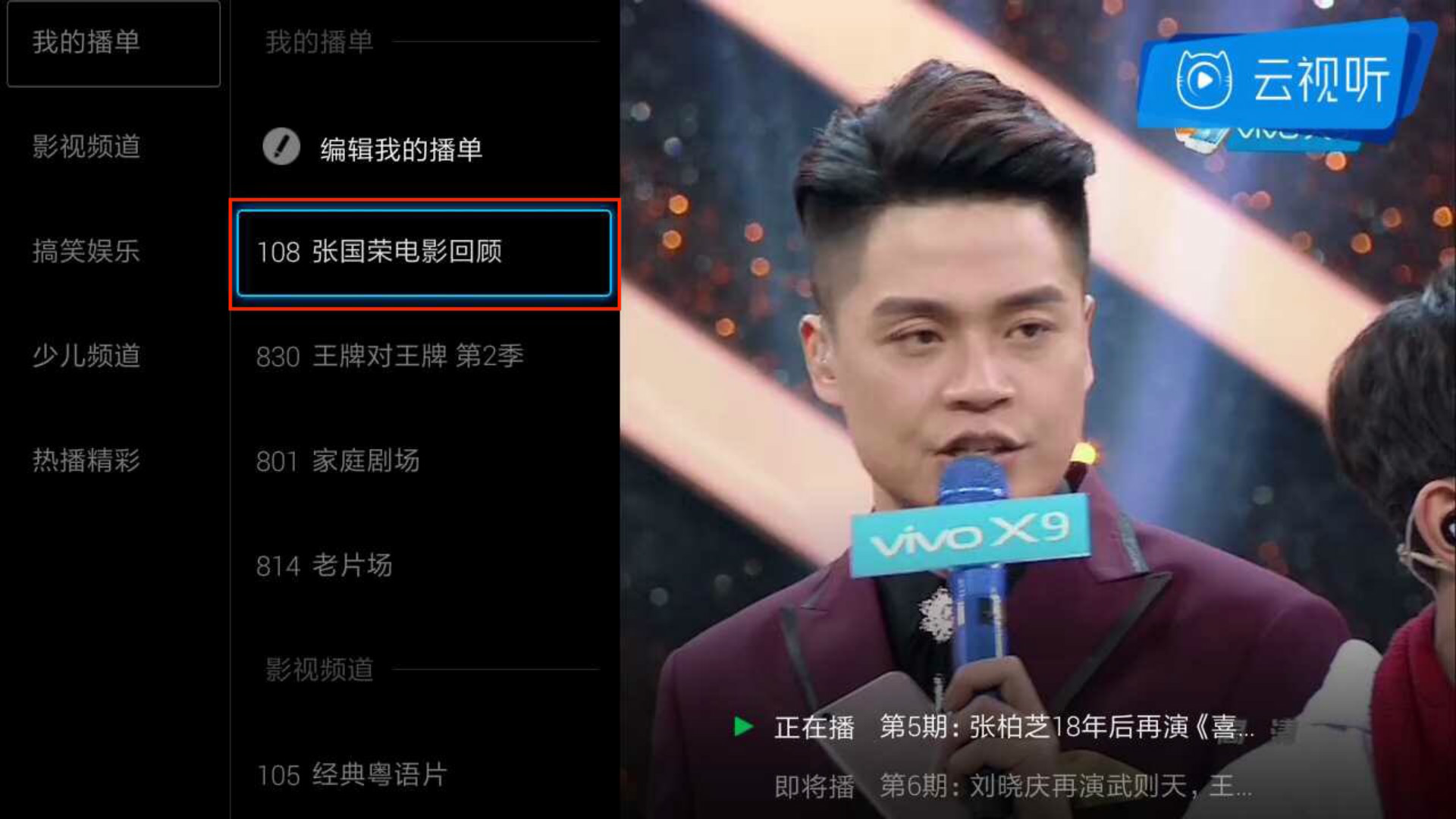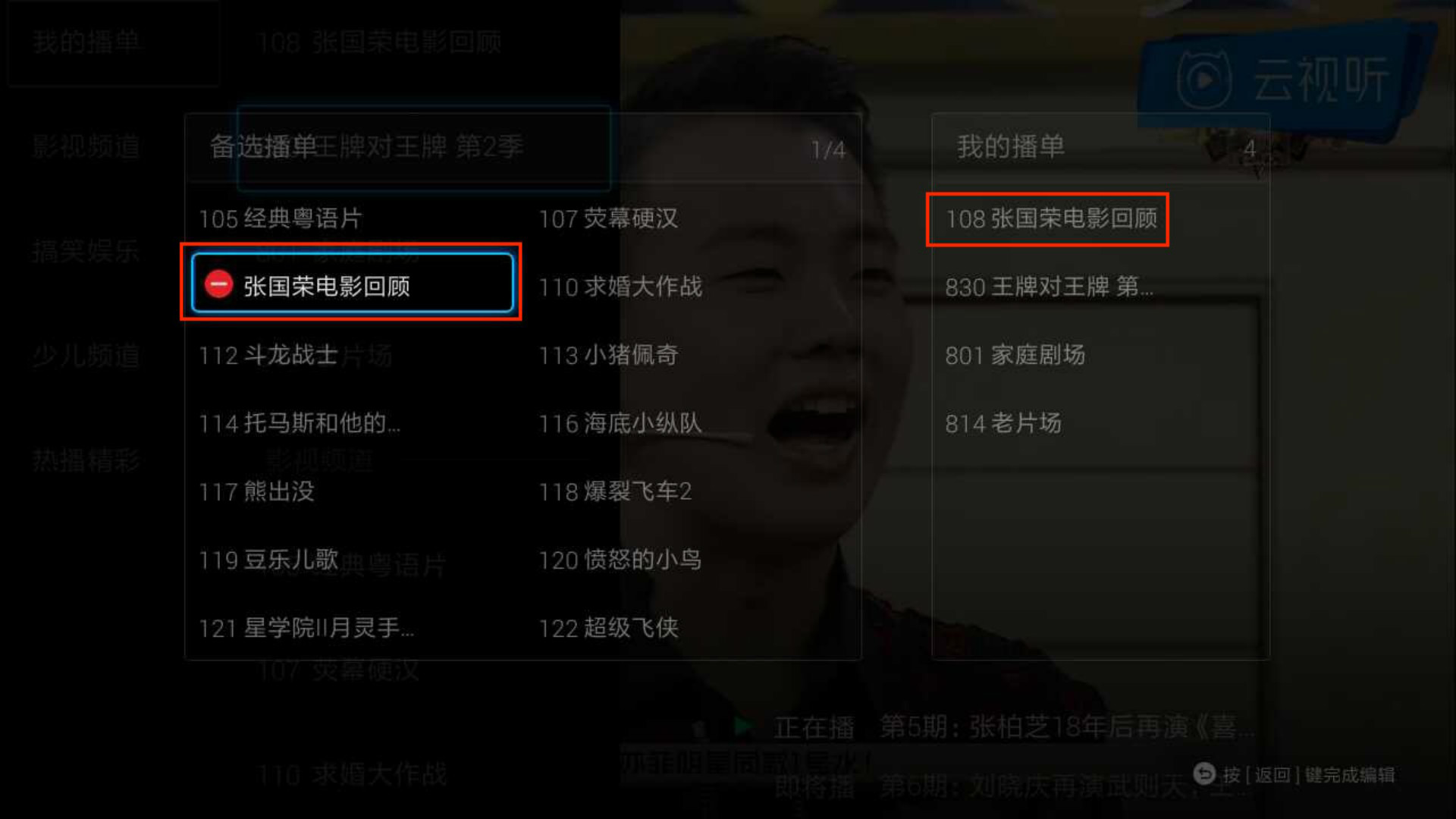 2.在備選播單頁(yè)面中,點(diǎn)擊中意的播單進(jìn)行添加,已選中的播單就會(huì)出現(xiàn)在屏幕右側(cè)【我的播單】中,小編喜歡看張國(guó)榮的電影,這里就以“張國(guó)榮電影回顧”播單為例;