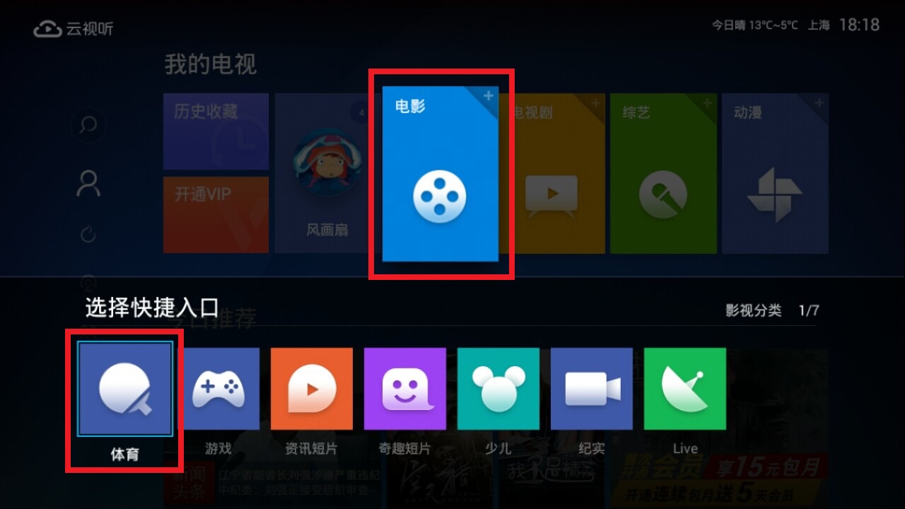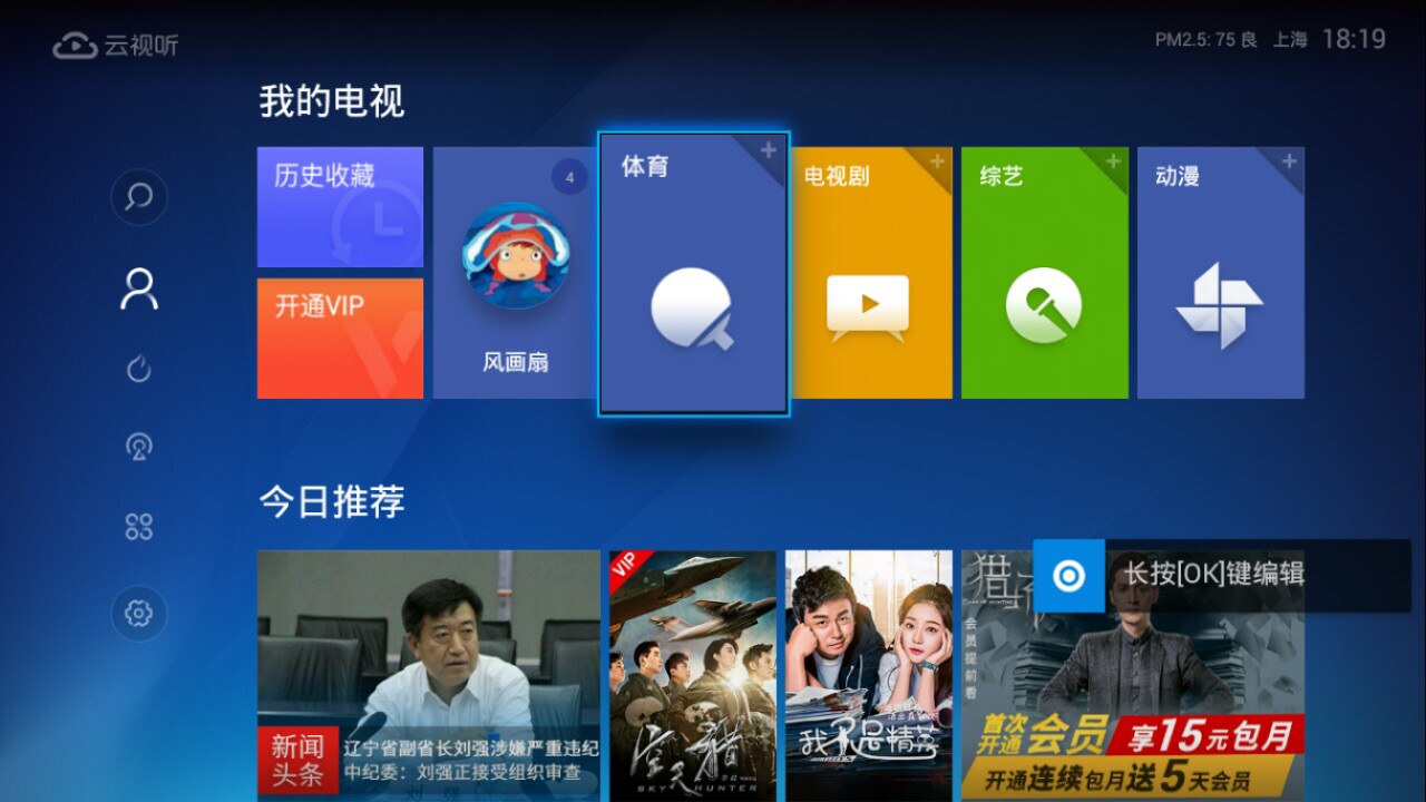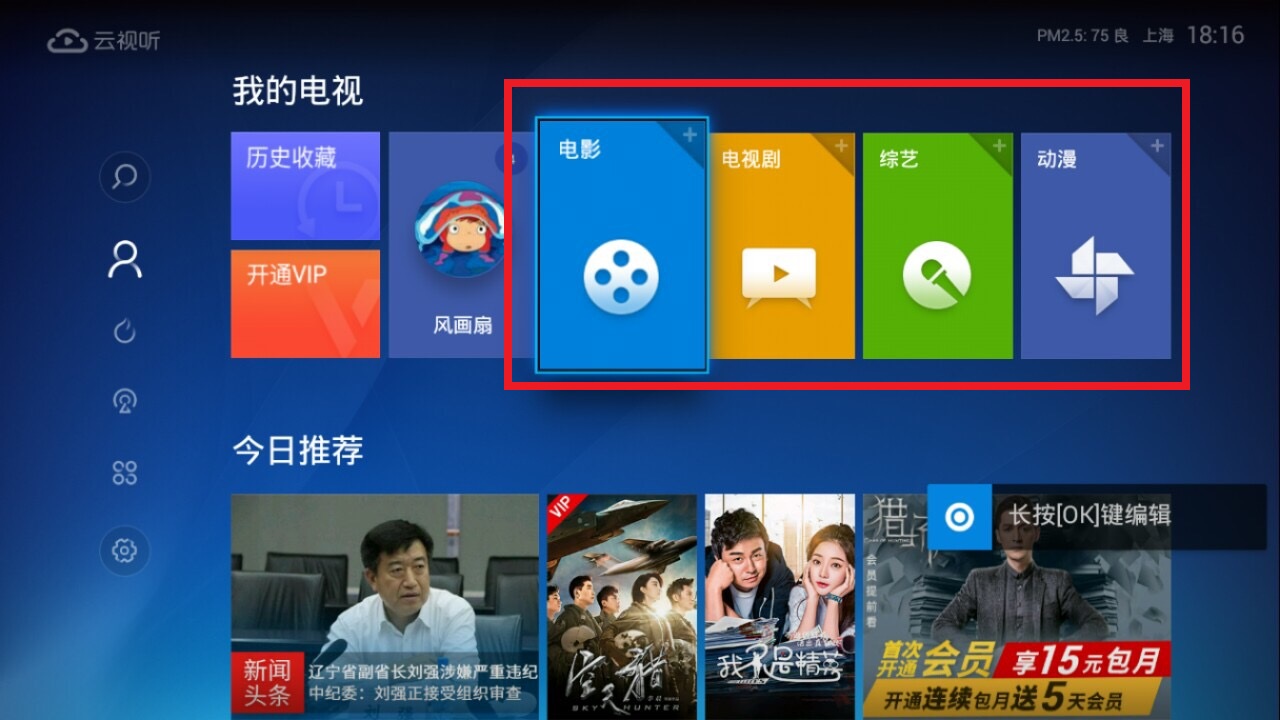 2.長(zhǎng)按OK鍵,出現(xiàn)替換模塊,共有9個(gè)內(nèi)容板塊隨心切換(電視劇、電影、體育、Live、綜藝、資訊短片、紀(jì)實(shí)、動(dòng)漫、少兒);