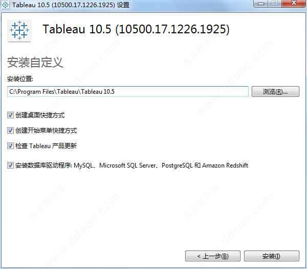 1、運行"TableauDesktop-64bit-10-5-0.exe",勾選用戶協(xié)議,點擊自定義自行選擇安裝類型,或者直接點擊安裝