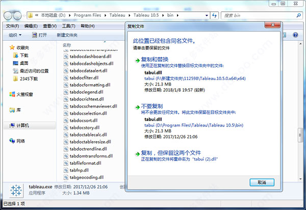 4、打開安裝包“x64”目錄,將tableau 10破解補丁“tabui.dll”復(fù)制到安裝目錄下覆蓋源文件