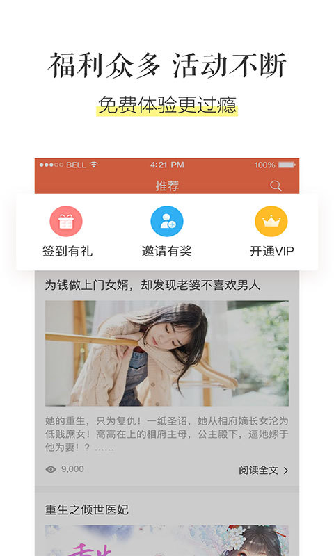 4.實惠沒有之一:免費小說專欄天天更新,簽到能賺錢:每日簽到換閱讀幣,簽的多,領(lǐng)的多看的多,免費追書就是這么簡單。