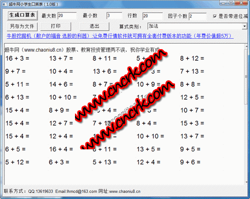 超牛網(wǎng)小學(xué)口算表讓你自己東西給您的孩子制作任意四則運(yùn)算口表,從每日一練中逐步提升您孩子的筆算和口算能力。