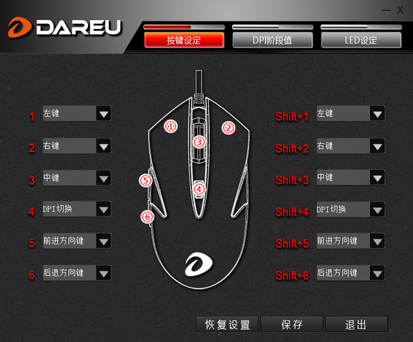 1、鼠標按鍵設(shè)定可以設(shè)置鼠標的左鍵、右鍵、中鍵、DPI切換鍵以及側(cè)鍵的功能