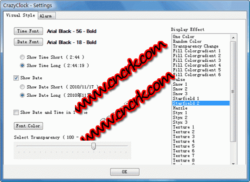CrazyClock是一個(gè)帶鬧鐘和視覺(jué)特效功能的免費(fèi)時(shí)鐘軟件。與其它同類(lèi)軟件相比,它的最大特點(diǎn)是內(nèi)置了大量的視覺(jué)特效,讓你的桌面時(shí)鐘與眾不同,支持設(shè)置報(bào)時(shí)聲音并啟動(dòng)某個(gè)自定義的應(yīng)用程序。你可以把CrazyClock定位在屏幕的任何地方,支持位置鎖定、置頂和透明效果,時(shí)鐘界面的文字大小和字體也可以隨意調(diào)整!