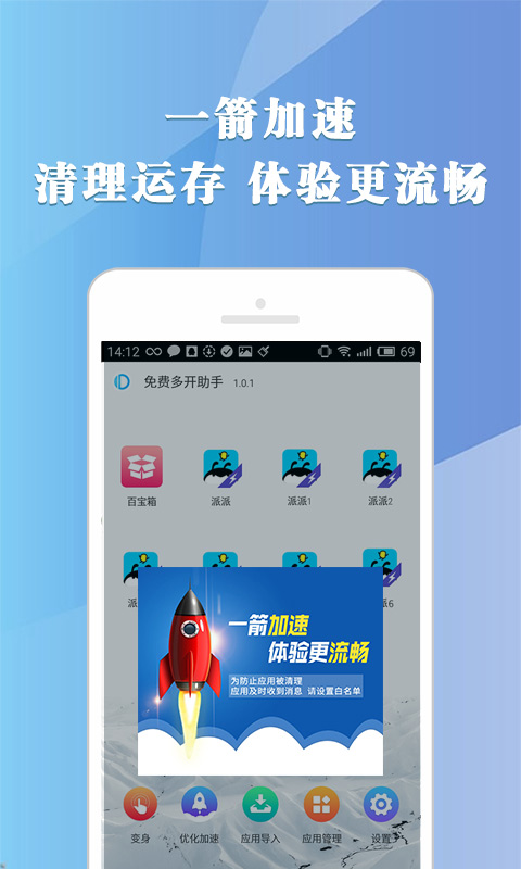 1.免費(fèi)應(yīng)用雙開全球首款免費(fèi)多開類APP,免費(fèi)支持社交軟件、娛樂、游戲應(yīng)用、購物、視頻、音樂等等幾乎所有APP的雙開,多開,分身,解決用戶的多賬戶需求。