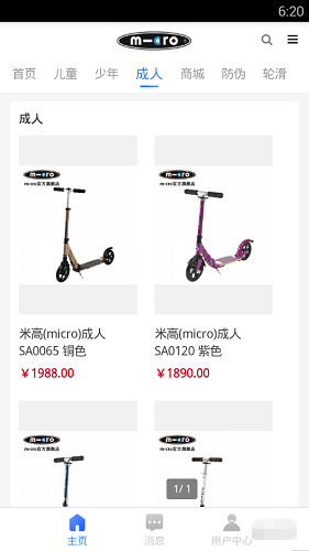 micro滑板車是一款由石家莊憶古科技有限公司開(kāi)發(fā)的一款主賣這個(gè)品牌滑板車的app,老少皆宜,見(jiàn)面簡(jiǎn)潔明了,分類清晰。有著少兒專欄、青年專欄、成人專欄等。