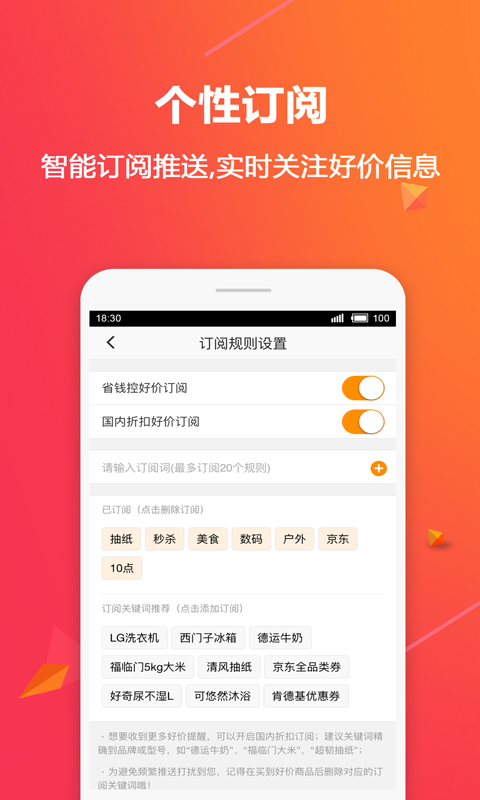 智能訂閱關(guān)鍵詞推送,從上千條折扣中為您推送感興趣的優(yōu)惠商品,輕松實現(xiàn)全網(wǎng)特賣監(jiān)控,不再錯過商品打折信息。