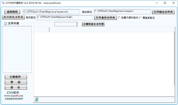 CYY文件代替助手是一款綠色小巧的文本替換軟件??梢耘啃薷恼麄€(gè)路徑的文件內(nèi)容或者文本內(nèi)容,還可一鍵恢復(fù)原來(lái)的文件或文件夾,支持批量替代備份和覆蓋原路徑。需要的快來(lái)下載吧!【軟件特點(diǎn)】