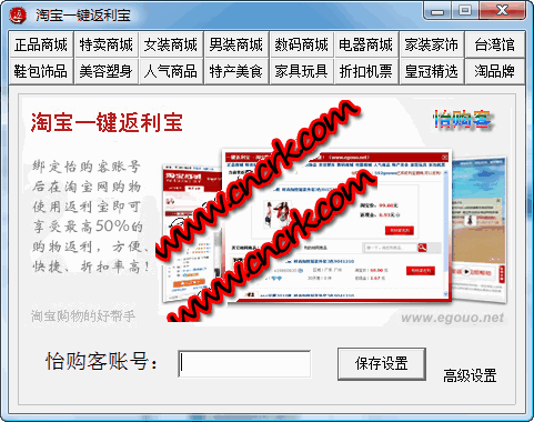 淘寶一鍵返利寶 V1.0 簡(jiǎn)體中文綠色免費(fèi)版 淘寶一鍵返利寶是怡購(gòu)客專(zhuān)門(mén)為淘寶網(wǎng)廣大買(mǎi)家設(shè)計(jì)的一款小巧易用的淘寶購(gòu)物返利軟件,用戶(hù)只需將軟件下載到自己的電腦上并捆綁上怡購(gòu)客的賬戶(hù)即可享受在淘寶網(wǎng)購(gòu)物最高達(dá)50%的購(gòu)物返利!該軟件是一款免安裝,純綠色的瀏覽器插件,暫只適用于以IE為內(nèi)核的瀏覽器中。