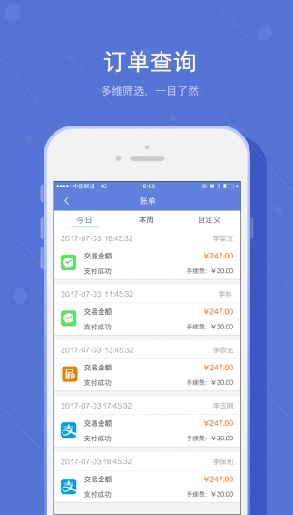 【收款】商戶可快速開通微信支付、支付寶、農(nóng)信快捷支付方式,支持消費(fèi)者掃碼支付、移動(dòng)支付、收款更便捷;【賬單】查詢每筆交易訂單狀態(tài),多維度查看交易情況;