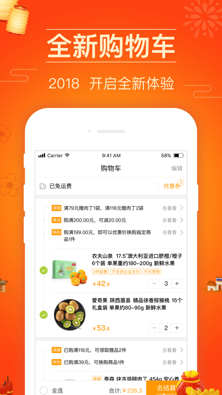 【新年惠購】新年優(yōu)惠集結(jié),實(shí)實(shí)在在折扣,誠心誠意的溫暖。每天超級品牌日甄選品質(zhì)明星商品,限時特惠狂歡不停。【年貨狂潮】愛與你年一起。狗年為重要的TA挑禮物,當(dāng)然要一絲不茍!本來生活上百種年貨禮盒,堅(jiān)果、水果、零食、干貨、海鮮、肉禽因有盡有,把你的心意送上TA的心尖,情到歡喜到,禮到福氣到。