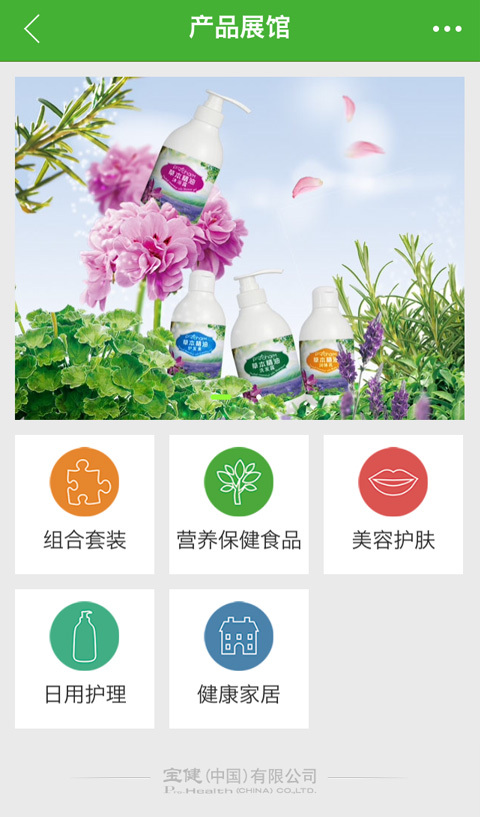 2.產(chǎn)品展館包括組合套裝、營(yíng)養(yǎng)保健食品、美容護(hù)膚、日用護(hù)理、健康家居等選項(xiàng),如圖: