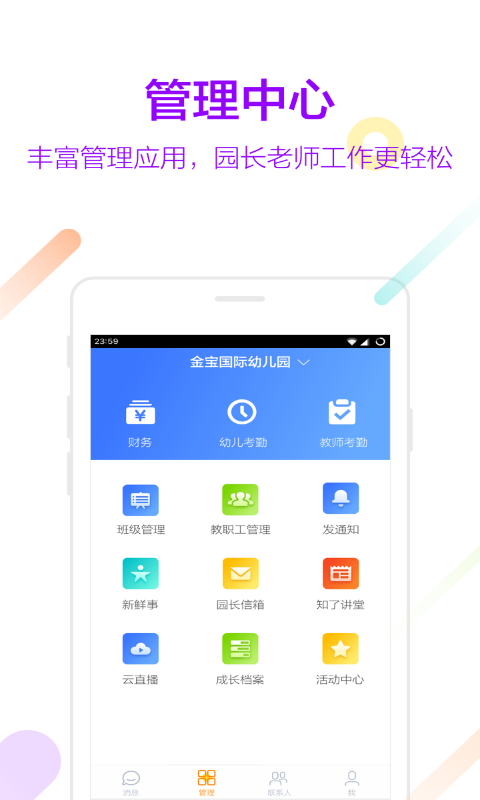 【園長(zhǎng)】知了,不僅是家園溝通APP平臺(tái),更是園長(zhǎng)的移動(dòng)智慧顧問(wèn),輕松完成全員師生信息及考勤管理,園所通知發(fā)布,全員新鮮事查看管理等,便捷實(shí)現(xiàn)園務(wù)溝通。