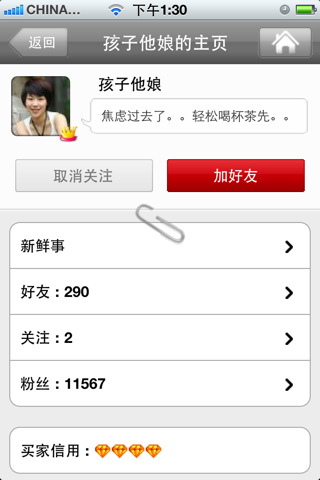 1.好友管理,管理自己的好友、關(guān)注和粉絲,即時(shí)處理好友申請(qǐng)!2.個(gè)人中心,消息提醒,新鮮事、好友信息、消息提醒,一目了然,時(shí)尚話題聊個(gè)夠!