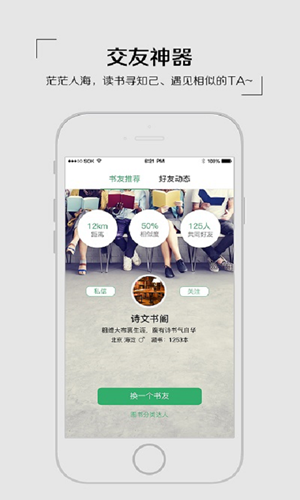 1、好友推薦:依據(jù)距離、相似度、共同好友三個維度為您推薦書友。