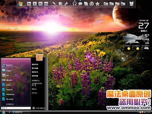 魔法桌面原創(chuàng)xp仿vista桌面主題——絢麗海平線,在這款主題中漂亮的開始菜單和標題欄特別搶眼,粉色到紫色的過渡突出了絢麗的效果。為了獲得更好的顯示效果,特別在開始菜單中“隱藏”了“注銷”按鈕,整體簡潔又美觀。為了獲得最佳顯示效果,請將桌面圖標大小調(diào)整為32×32。本主題包含兩種字體版本,默認是宋體版,您可以在“外觀”-“字體大小”處切換至微軟雅黑版。此主題還附帶精美的仿vista登陸界面哦~