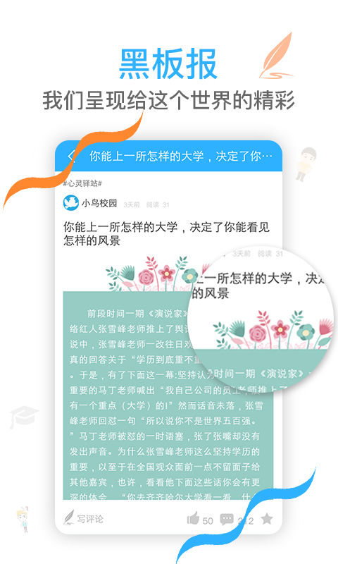 【黑板報】提供即時的教育資訊,學(xué)習方法經(jīng)驗分享,大學(xué)介紹,專業(yè)解讀,心理輔導(dǎo),科普教育...開闊眼界,增加見識,提高認知,可以更好的更科學(xué)的填報大學(xué),選擇專,業(yè)規(guī)劃人生。