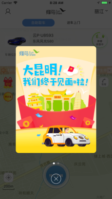 自助取車:快速匹配就近待租車輛,通過手機(jī)完成:注冊、審核、開鎖車門、還車、支付等租車步驟,全程自助式服務(wù)。