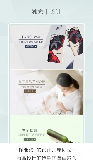 【在線自選:尊重用戶每一次選擇】拿手機坐著躺著都能實現(xiàn)的在線自由定制。支持定制的美物一目了然擺脫尋物狂躁感,周周上新的設計酷圖拒絕過期時尚,導入個人美照中外文字輸入樣樣具備。像美顏相機一樣為自己理想的生活品選擇中意的外貌設計。功能操作簡單好用,生活格調(diào)簡單創(chuàng)造。讓每個用戶無壓力表達對品味美感的理解。