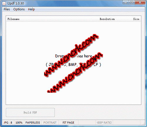 i2pdf 支持 jpg , png , bmp , tiff , gif 格式的圖片。主界面相當(dāng)?shù)暮啙?,如果你想對文檔進一步設(shè)置,可以到菜單欄上的 Options 選項。