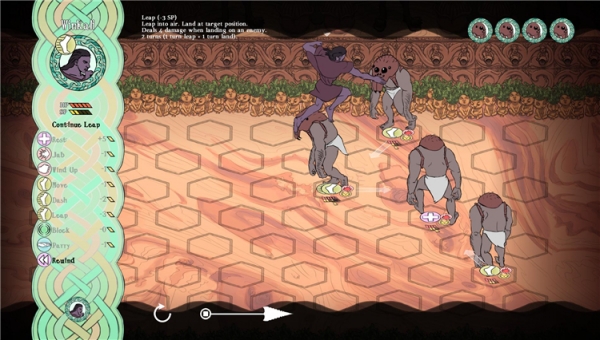 以六角戰(zhàn)棋作基礎(chǔ)的戰(zhàn)斗系統(tǒng)非常溫柔。在每回合開(kāi)始時(shí),你都能通過(guò)拉動(dòng)下方箭頭來(lái)預(yù)先觀看敵人本回合的動(dòng)作,并據(jù)此調(diào)整我方人物行動(dòng),即便一時(shí)疏忽也不要緊,你還可以選擇將時(shí)間倒回上一回合來(lái)重新部署,而無(wú)論是觀看未來(lái)還是回到過(guò)去,都不需要付出任何代價(jià)。這就讓?xiě)?zhàn)斗變得十分愜意,但又因?yàn)閿橙藫碛卸喾N行為模式而并不輕松,有些戰(zhàn)斗仍需要玩家動(dòng)腦思考破敵之法才能取勝。