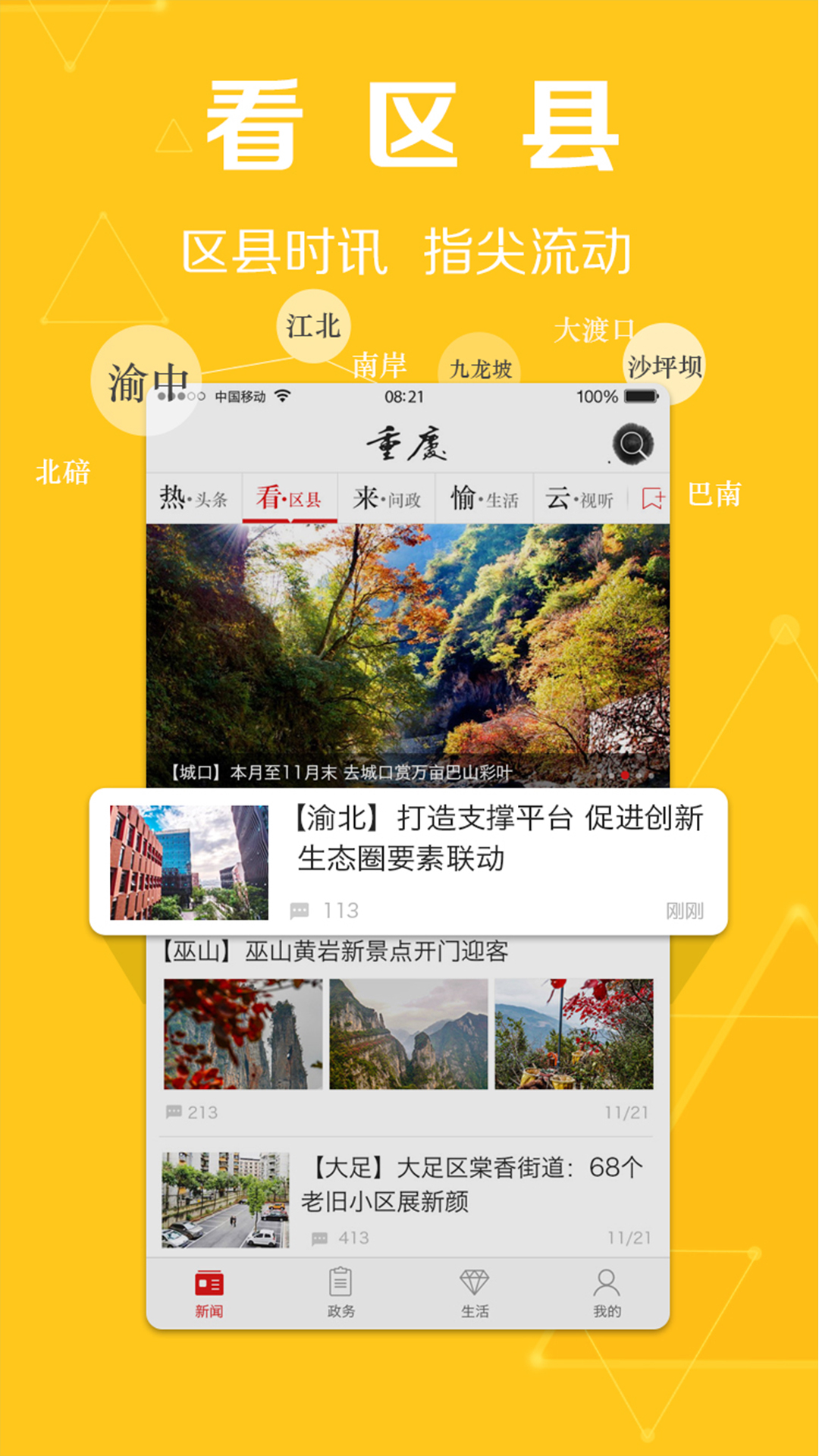 看區(qū)縣,區(qū)縣時(shí)訊,指尖流動(dòng)。渝中、萬(wàn)州、江津、墊江、開(kāi)州、銅梁、長(zhǎng)壽、云陽(yáng)、渝北、江北、沙坪壩、武隆等重慶城38個(gè)區(qū)縣新聞嘿快更新,一覽便知。