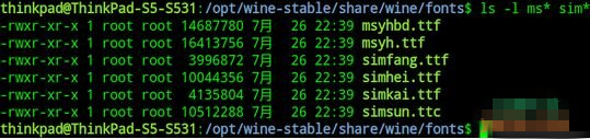 將以下simfang.ttf、simhei.ttf、simkai.ttf、simsun.ttc字體文件復(fù)制到Wine安裝路徑下的字體目錄/opt/wine-stable/share/wine/fonts即可,你也可以將更多字體復(fù)制到該目錄下。