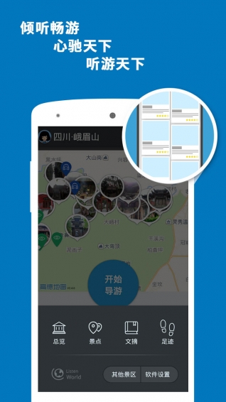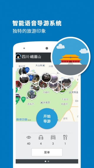 峨眉山導(dǎo)游app是一個(gè)專業(yè)的智能語音導(dǎo)游系統(tǒng),專門為喜歡自由行的旅行愛好者而設(shè)計(jì)。峨眉山導(dǎo)游app是將語音導(dǎo)游、門票信息、旅游攻略、景點(diǎn)美圖、旅游足跡等全面集中展現(xiàn)。 峨眉山導(dǎo)游app像一個(gè)經(jīng)驗(yàn)豐富的導(dǎo)游,當(dāng)您進(jìn)入景區(qū)時(shí),及時(shí)地向您推薦您當(dāng)前的游覽線路及沿途景點(diǎn);當(dāng)您漫步在景區(qū)時(shí),峨眉山導(dǎo)游能根據(jù)當(dāng)前您所處的景點(diǎn)位置,為您提供生動(dòng)的語音解說及詳盡的圖文介紹;當(dāng)您處在景區(qū)外時(shí),峨眉山導(dǎo)游是一本妙趣橫生的百科全書,圖文并茂地向您展示著景區(qū)深邃的文化內(nèi)涵和豐富的歷史積淀,讓您體驗(yàn)到景區(qū)身臨其境的愉悅感。