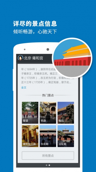 雍和宮導(dǎo)游app——語(yǔ)音自動(dòng)播報(bào)導(dǎo)游系統(tǒng),攜手科大訊飛,帶給您獨(dú)特的北京印象。雍和宮是北京市內(nèi)最 大的藏傳佛教寺院。整座寺廟規(guī)模宏大,建筑豪華,保存完美,珍藏文物極其豐富多彩,深為世人所重視。