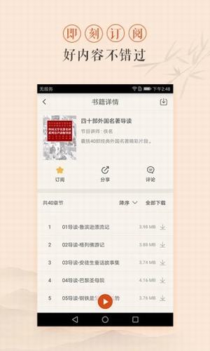 3、支持下載節(jié)目章節(jié),WIFI下載,隨時(shí)隨地可聽,無需再消耗流量。